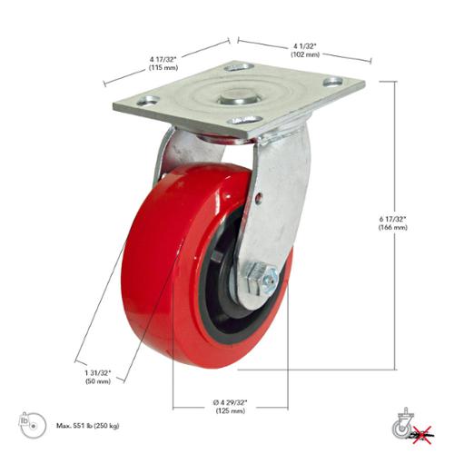 F22105 CASTER MOLD-ON RED PU 5IN SWIVEL