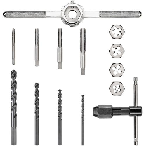 • Package Contents: Four fractional taps, four large hexagon dies, four drill bits, one tap handle, one large hex die handle