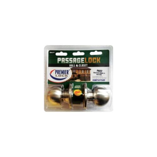 Passage lock, stainless steel finish, round ball knob, adjustable latch 2-3/8"" to 2-3/4"", door thickness 1-3/8"" to 1-3/4""